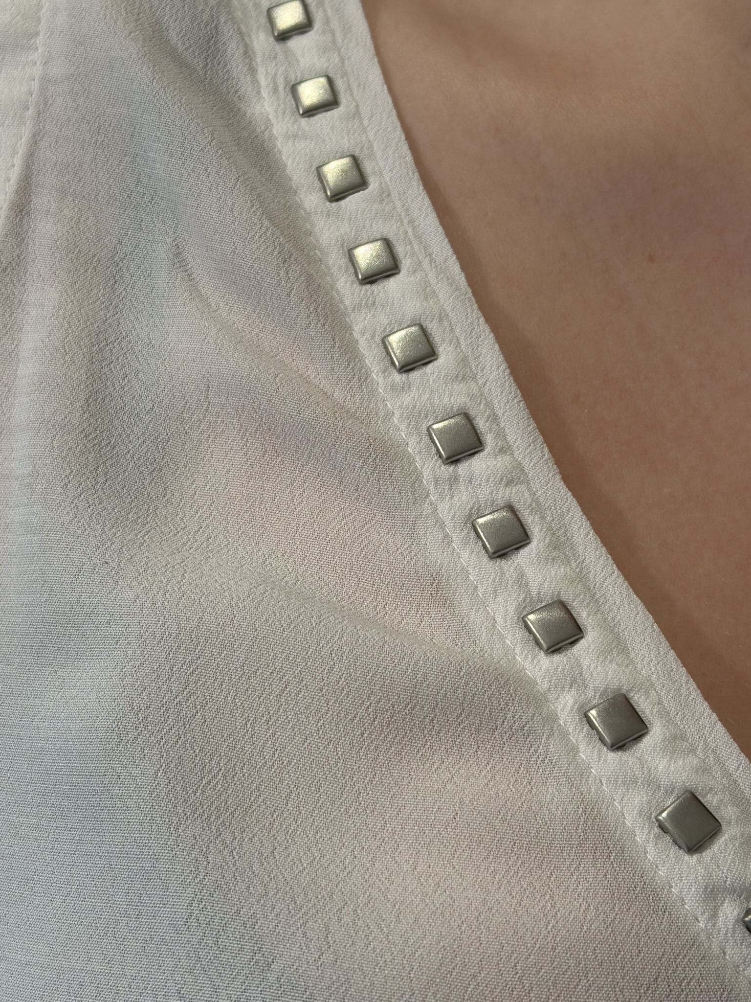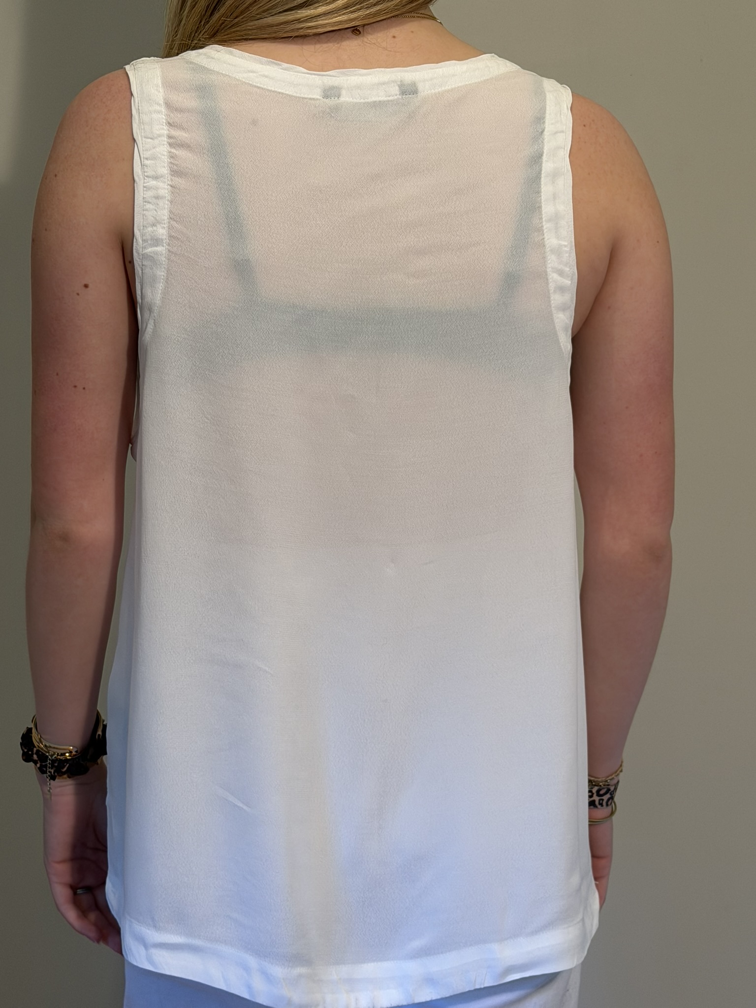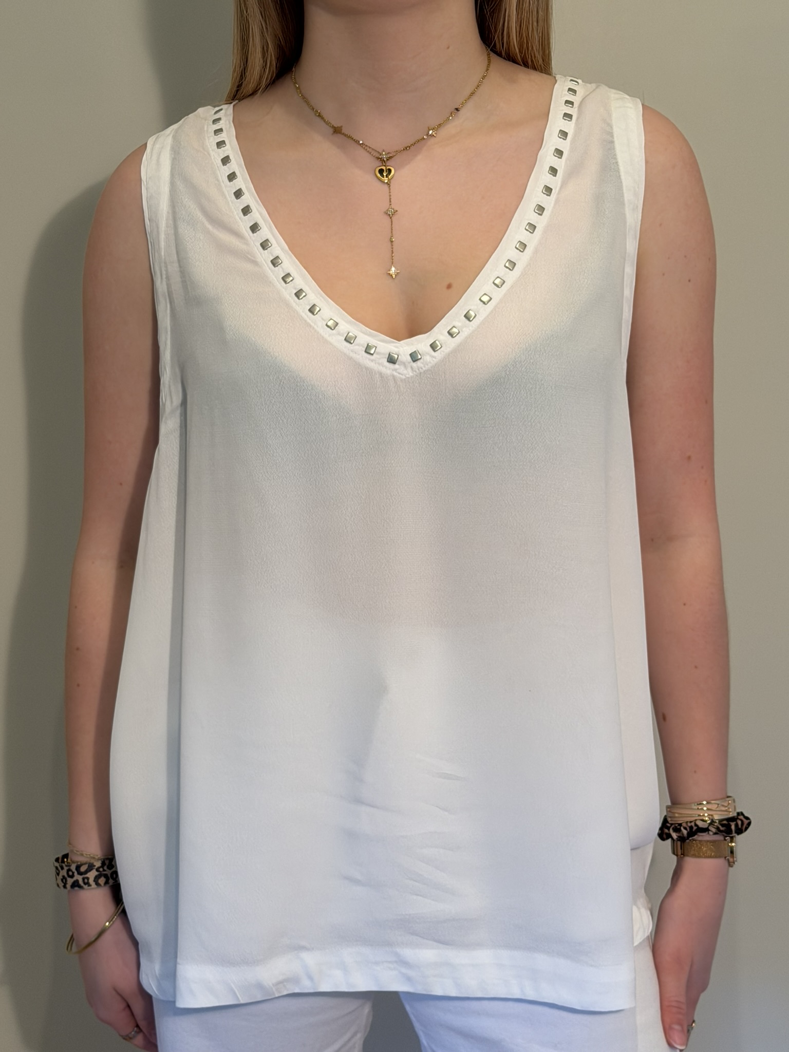 Réalisée en maille légère en pure viscose, la débardeur Amanda se distingue par sa texture fluide et fraîche, avec un effet semi-transparent qui confère au vêtement une élégance délicate et contemporaine. La ligne sans manches et l’encolure v orné de petits clous mettent en valeur la simplicité du design, le rendant parfait pour la saison estivale. Un modèle qui incarne le raffinement naturel de Mason’s, alliant légèreté, confort et essentialité sophistiquée.