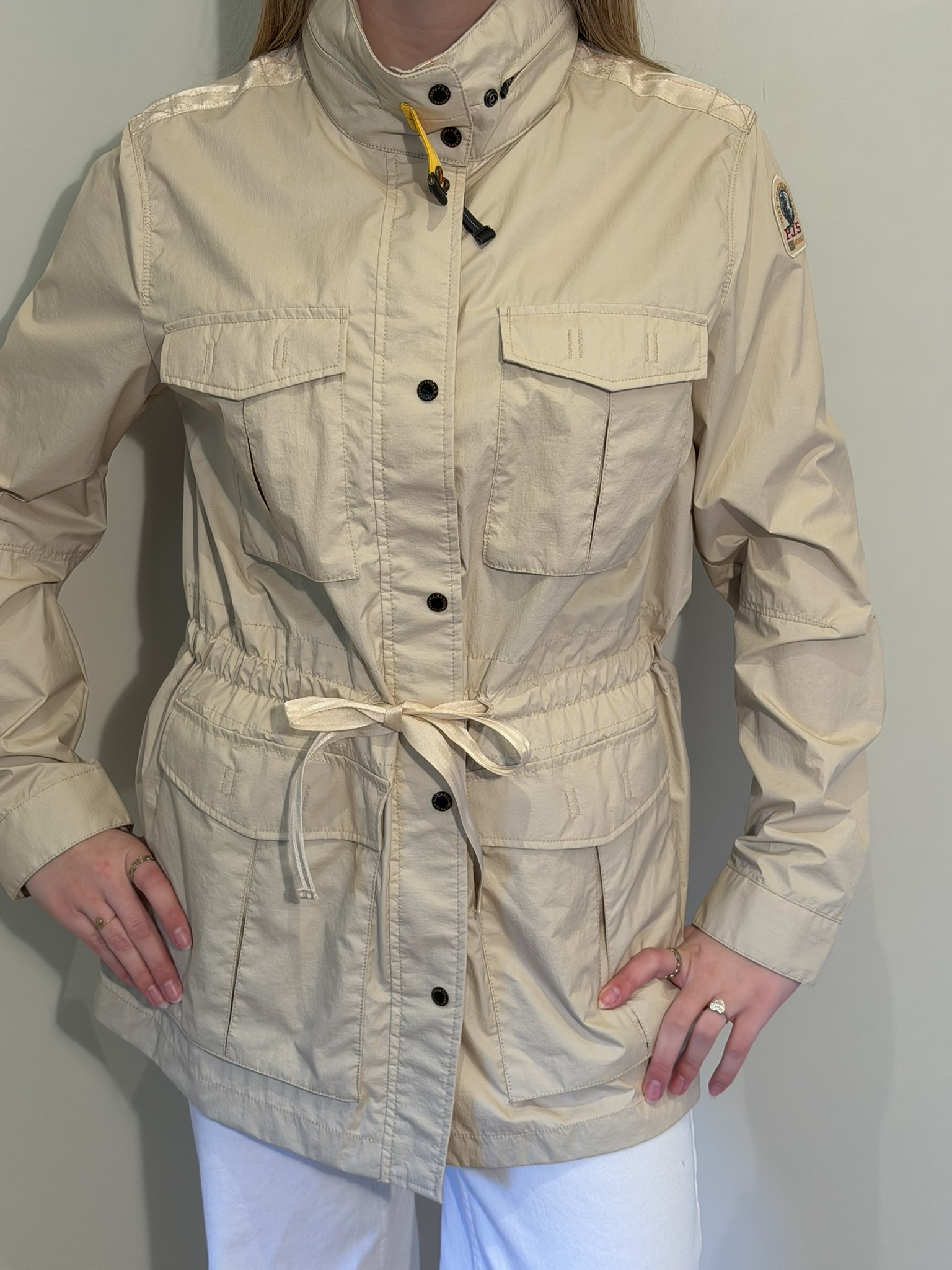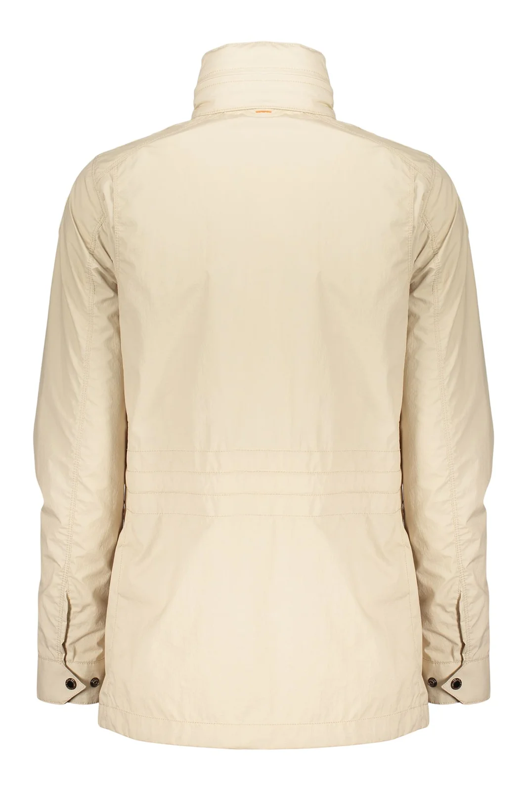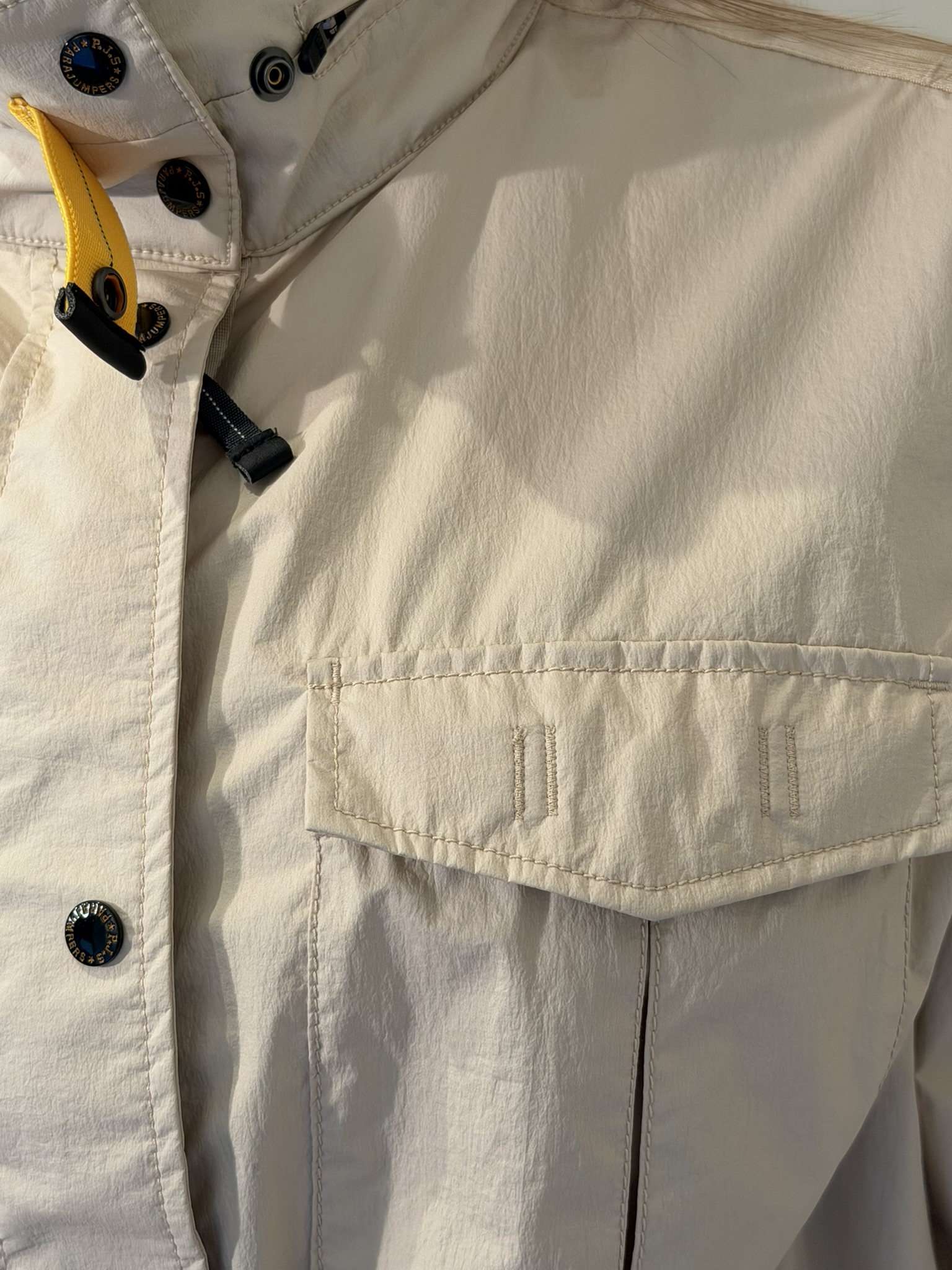 Ce manteau à la coupe classique, doté d’un col montant et d’une fermeture boutonnée, arbore une teinte beige clair aux subtiles influences minimalistes et intemporelles. Sa taille ajustable par cordon et ses manches longues pratiques en font une pièce facile à porter au quotidien et lors de sorties décontractées.
