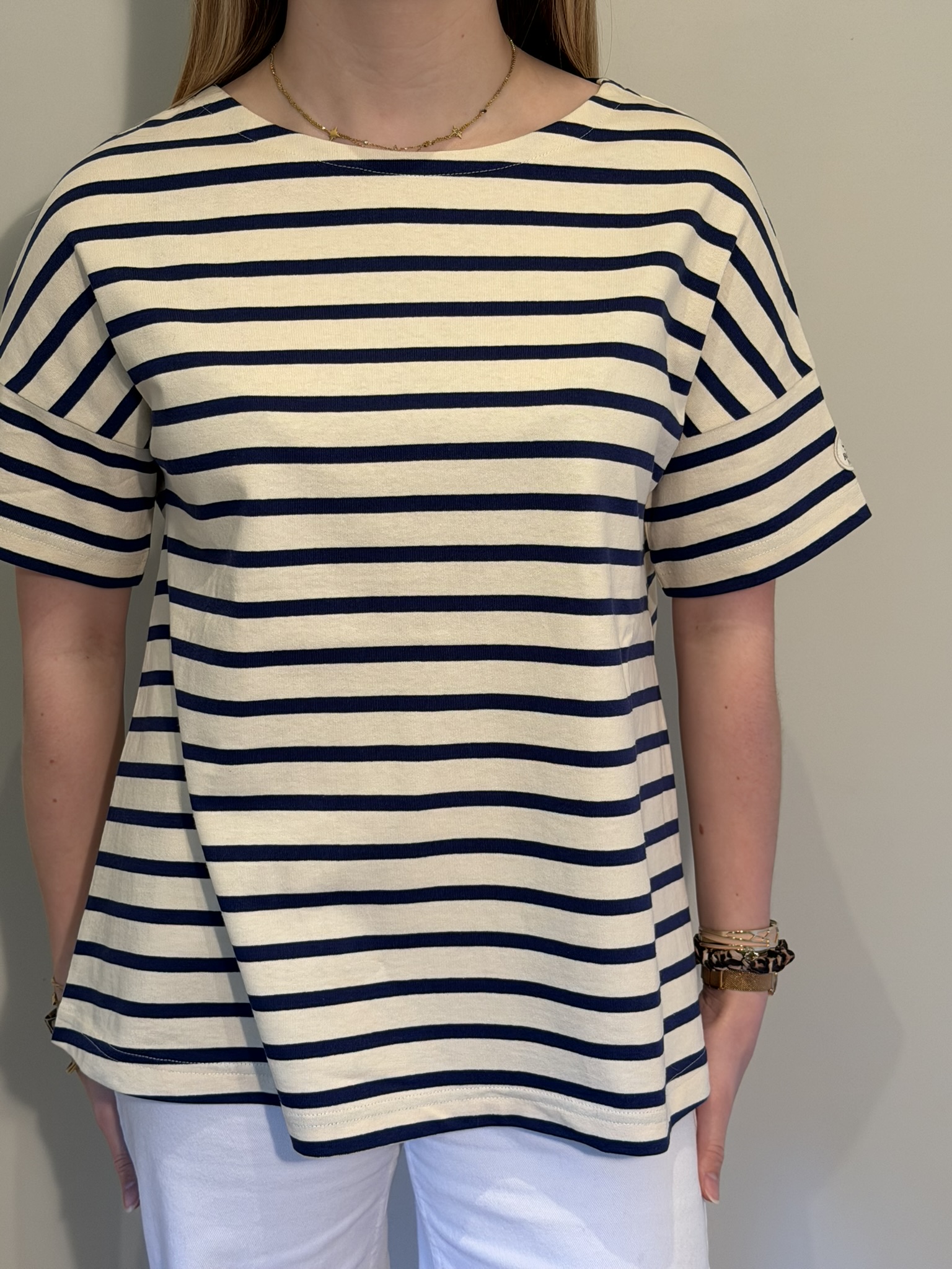 Revendiquez votre style marin avec la marinière Marie en couleur Ecru et Marine, une pièce emblématique qui incarne l’élégance intemporelle. Dotée d’une encolure bateau classique et de manches courtes, cette marinière offre un look à la fois sophistiqué et décontracté. Fabriquée à partir de 100% coton peigné, elle offre un confort exceptionnel et une douceur incomparable. Parfaite pour toutes les occasions, la marinière est un indispensable de toute garde-robe. Coupe over size.